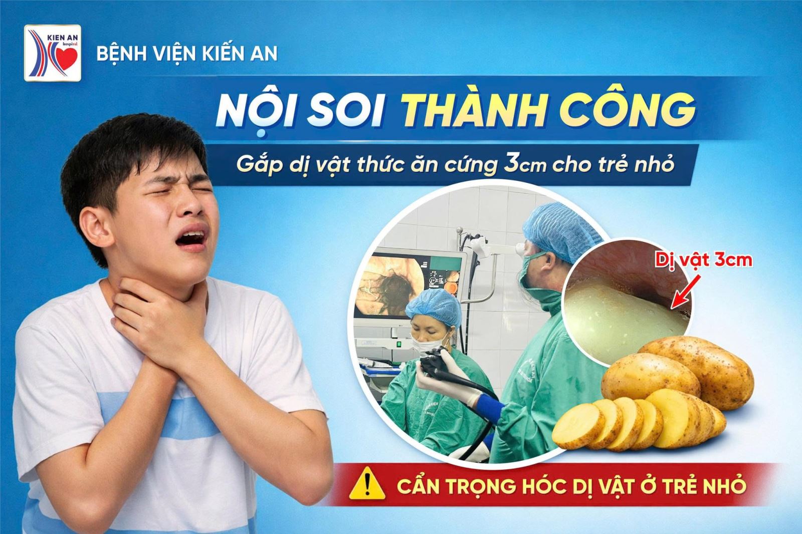 Các bác sĩ Bệnh viện Kiến An vừa thực hiện thành công một ca nội soi gắp dị vật đường tiêu hóa cho bệnh nhi với dị vật là một miếng thức ăn cứng có kích thước khoảng 3cm.