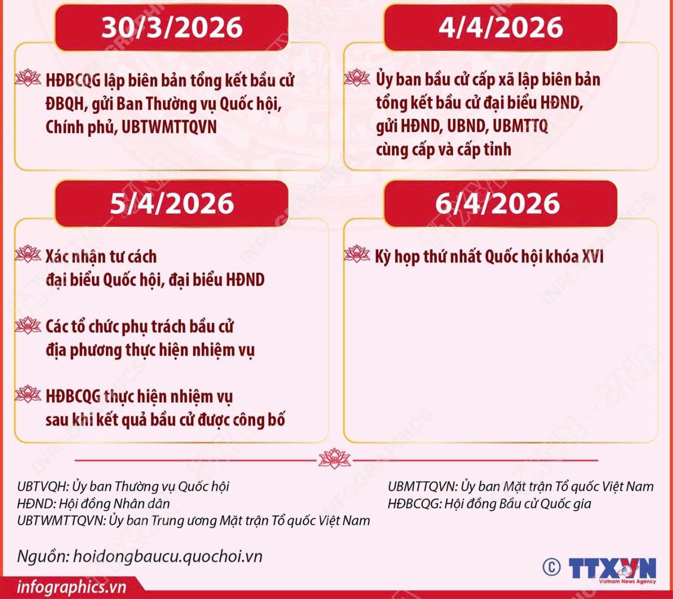 CÁC MỐC THỜI GIAN SAU KHI DIỄN RA CUỘC BẦU CỬ ĐẠI BIỂU QUỐC HỘI KHOA XVI VÀ ĐẠI BIỂU HĐND CÁC CẤP NHIỆM KỲ 2026 - 2031