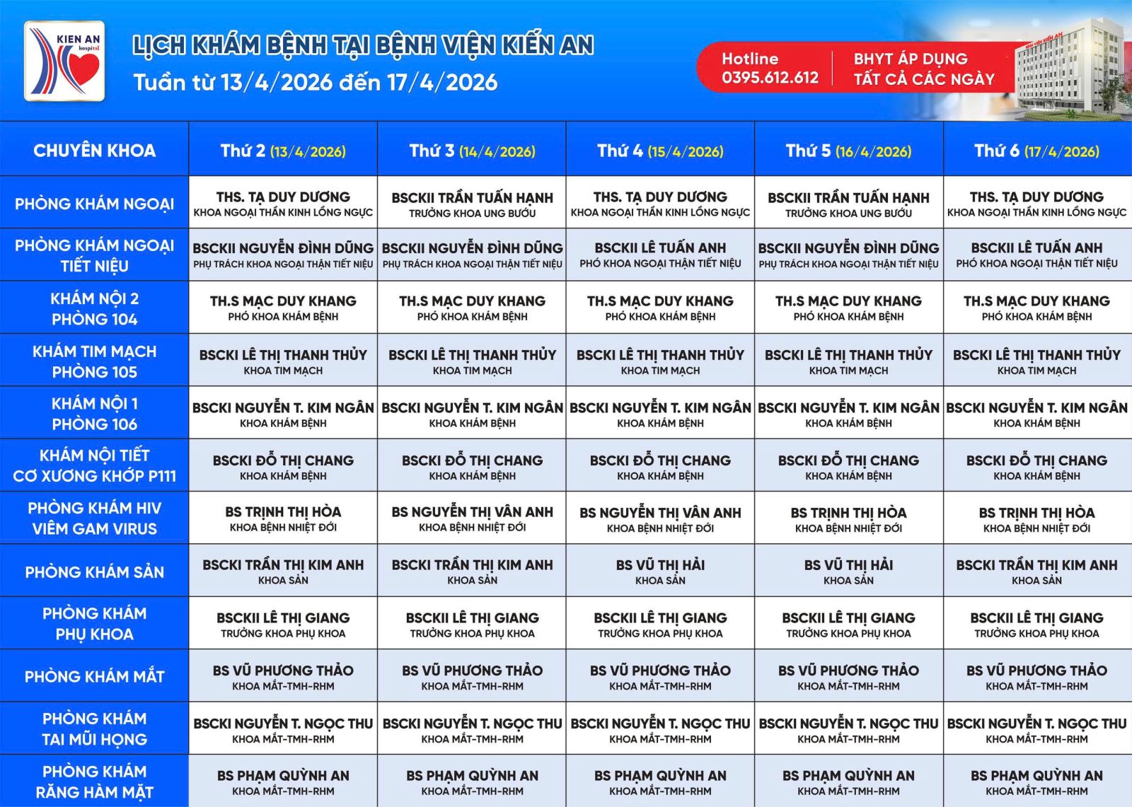 BỆNH VIỆN KIẾN AN CẬP NHẬT HÀNG TUẦN: TỪ 13-17/4/2026