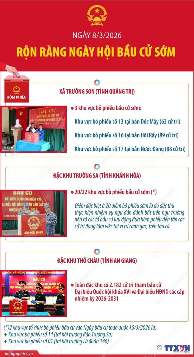 Sáng 8/3/2026, quân và dân ở 20/22 tổ bầu cử thuộc đặc khu Trường Sa (tỉnh Khánh Hòa) rộn ràng đi bỏ phiếu bầu cử đại biểu Quốc hội khóa XVI và HĐND các cấp nhiệm kỳ 2026-2031. Cùng ngày, cử tri đặc khu Thổ Châu (tỉnh An Giang) cũng thể hiện tinh thần trách nhiệm cao, thực hiện quyền và nghĩa vụ công dân, nô nức đi bầu cử đại biểu Quốc hội khóa XVI và đại biểu HĐND các cấp nhiệm kỳ 2026-2031. Đồng bào Bru-Vân Kiều tại các bản Hôi Rấy, Nước Đắng và Dốc Mây thuộc xã Trường Sơn (tỉnh Quảng Trị) cũng đã bỏ phiếu bầu cử sớm đại biểu Quốc hội khóa XVI và HĐND các cấp nhiệm kỳ 2026-2031 vào sáng 8/3/2026, sớm hơn 1 tuần so với thời điểm diễn ra bầu cử chính thức của cả nước.