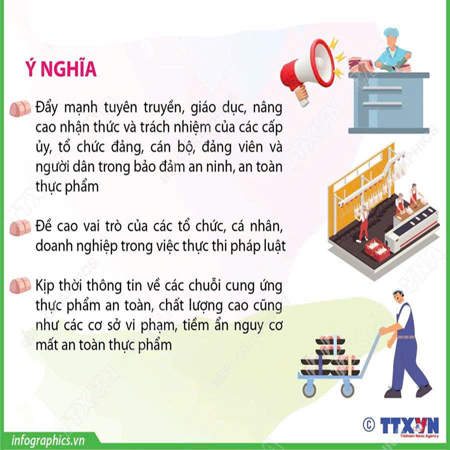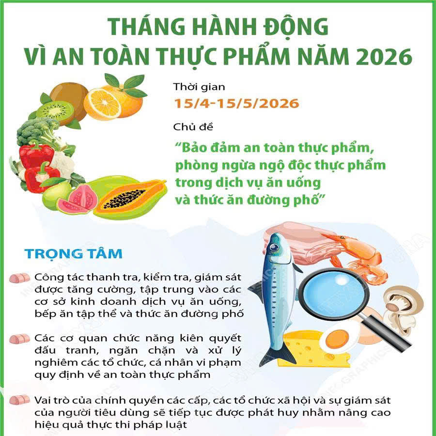 Ban Chỉ đạo liên ngành Trung ương về an toàn thực phẩm phát động Tháng hành động vì an toàn thực phẩm 2026, diễn ra từ ngày 15/4-15/5, tập trung siết chặt quản lý dịch vụ ăn uống, bếp ăn tập thể và thức ăn đường phố, đồng thời tăng cường thanh tra, xử lý nghiêm các vi phạm. Để tăng cường hơn nữa công tác bảo đảm an toàn thực phẩm, và phòng ngừa ngộ độc thực phẩm, nâng cao vai trò, trách nhiệm của người quản lý, người sản xuất, kinh doanh, tiêu dùng thực phẩm, chủ đề Tháng hành động vì an toàn thực phẩm năm 2026 là “Bảo đảm an toàn thực phẩm, phòng ngừa ngộ độc thực phẩm trong dịch vụ ăn uống và thức ăn đường phố”.